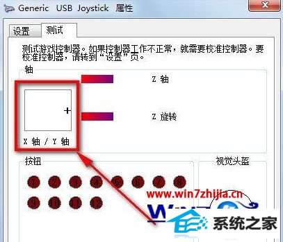 3、在【测试】选项卡下我们可以测试手柄各按钮是否正常工作。首先,可以旋转和按下手柄中的左面方向舵和方向按键,观看“x轴/Y轴”上方的十字光标运动是否正常。最终十字光标应居中显示。