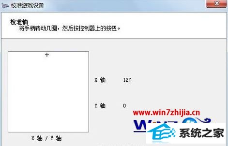 3、在【校准轴】界面,将手柄左方向舵旋转几圈,重新定位中心点。这个过程校准的是游戏手柄的“x轴/Y轴”。