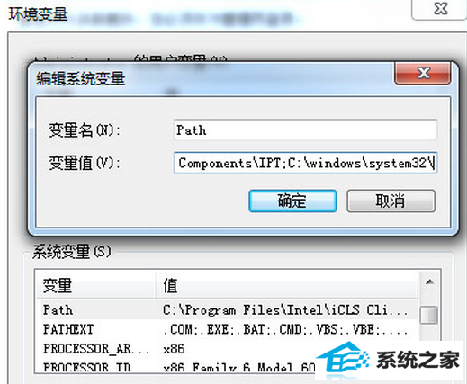 3、在win8“环境变量”窗口中,找到“系统变量”,在变量项中找到path的路径设置,点击下方的“编辑”按钮。将“;C:windowssystem32”复制进变量值处,然后点击确定即可。