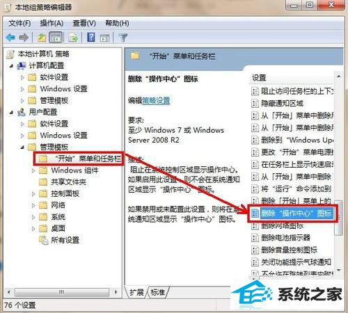 很多对电脑不太懂的朋友留言询win8系统笔记本电脑电源图标不见了的问题如何解决,虽然win8系统笔记本电脑电源图标不见了处理起来不是很难,可是网上众多朋友还不知道怎么处理,小编今天希望大家学习到的是win8系统笔记本电脑电源图标不见了比较容易操作的方法。你只用依照按照点击“win8功能键”+R组合键,然后运行“gpedit.msc”命令,这时候就会进入本地组策略编辑器。如上图所示的那样,直接选择“开始菜单和任务栏”,然后就再这个目录下面直接选中“删除操作中心图标”选项就可以了。的步骤即可,还有不知道win8系统笔记本电脑电源图标不见了么解决的朋友赶快来学习一下吧!