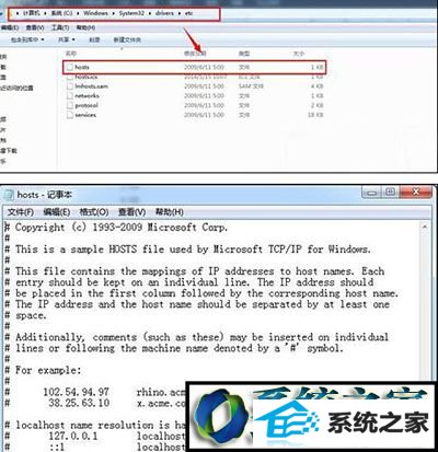 3、尝试打开win8系统中的Hosts文件,该文件主要作为ip转向使用,很多劫持者就是恶意更改这个文件来对网址进行恶意跳转,在C:/windows/system32/drivers/etc/文件夹中,右键点击Hosts文件用记事本打开,如果发现有不正常的ip或网址则删除,具体大家可以参照下图干净的Hosts文件,最后保存一下。