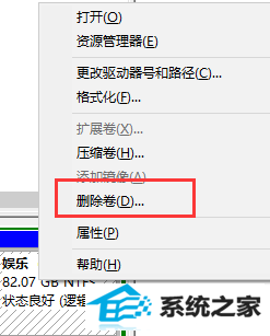 3、找到之前无法格式化的磁盘,单击右键,选择“删除卷”;