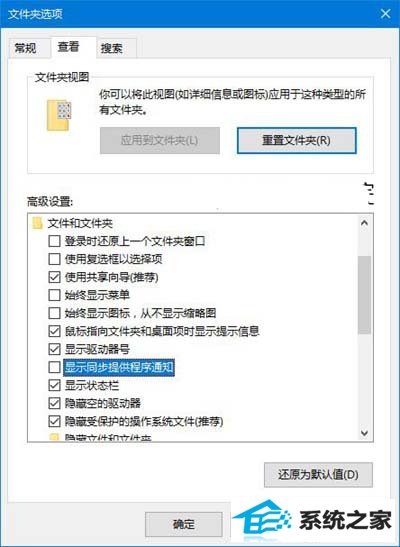 2.在接下来弹出的文件夹选项窗口中,切换到查看选项卡,然后将其中的“显示同步提供程序通知”取消勾选。