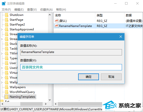 5、双击RenamenameTemplate,在“数值数据”中输入你想要的新建项目临时名称,例如“百事网文件夹”,如下图——