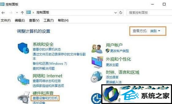 2、在控制面板窗口中选择“查看设备和打印机”;