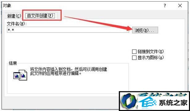 2、在弹出来的对象窗口中,就可以看到如下图中所示的窗口了,直接选择“由文件创建”tab标签,并单击“浏览按钮”。